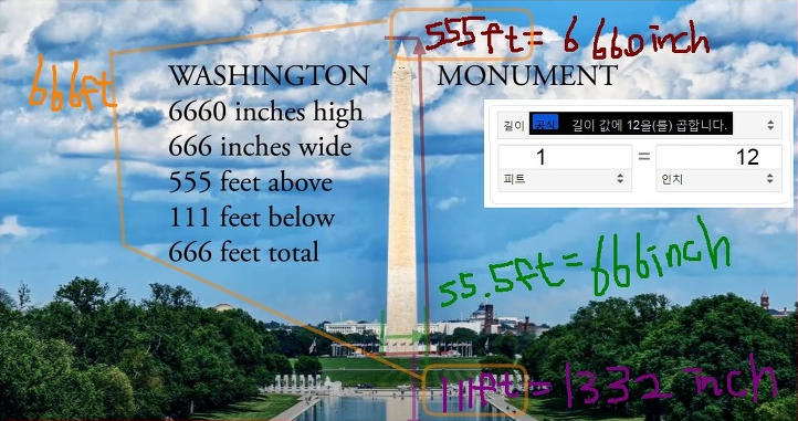 The Washington Monument, the largest obelisk (i.e. structure with no purpose other than to glorify the male sex organ) on earth, is built to a 10:1 ratio (same as the statue of King Nebuchadnezzar AKA Lucifer) and measures 555ʹ × 55ʹ which in inches comes to 6660ʺ × 660ʺ.