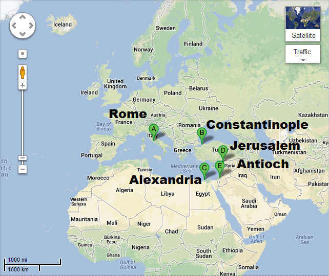 (cities of the “primate” bishops or patriachates) thus itemized per the Second Ecumenical Council, at Constantinople (A. D. 381)